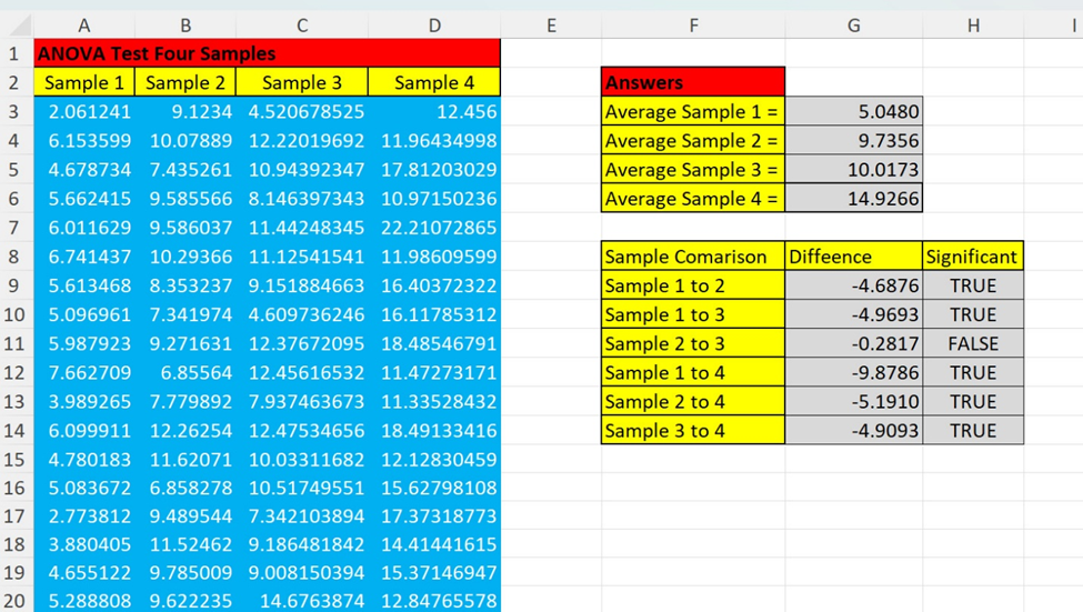 “The data is inputted in columns A through D. The results are in the gray cells. As you can see, the averages are in cells G3 through G6. Sample 1 is decisively lower, Samples 2 and 3 are about the same, and Sample 4 is distinctly higher. You can see from cells G9 to H14 that all differences are significant, except Samples 2 and 3. Are there any questions?” Megan asked.