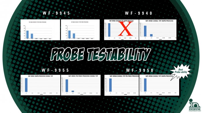 All-Star Engineer, The Alchemist và Shadow Warrior đều được thử nghiệm chỉ với đầu đục sau hai hồ sơ nhiệt độ khác nhau – quy trình SnPb (mát hơn) và quy trình không chì (nóng hơn). Kết quả được đo dọc theo trục X là điện trở và trục Y biểu thị phần trăm thử nghiệm cho thấy điện trở đó. Điểm 100% biểu thị điện trở bằng không hoàn hảo, nghĩa là cặn còn lại sau khi hàn không ảnh hưởng đến thử nghiệm điện. Biểu đồ ở đây cho thấy, nhìn chung, hồ sơ nóng hơn tạo ra cặn cứng hơn và đầu nhọn đâm xuyên tốt hơn đầu đục. Nó cũng cho thấy Shadow Warrior (WF-9958) đã thử nghiệm hoàn hảo trong mọi điều kiện.
